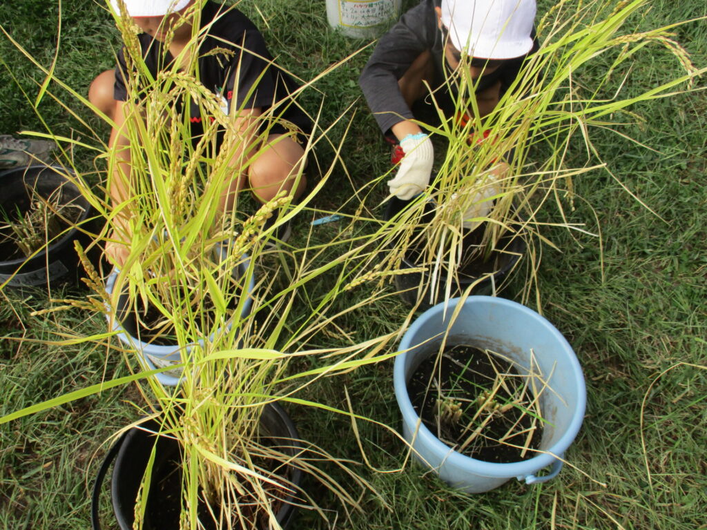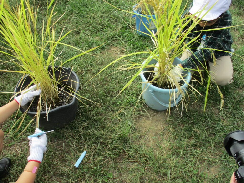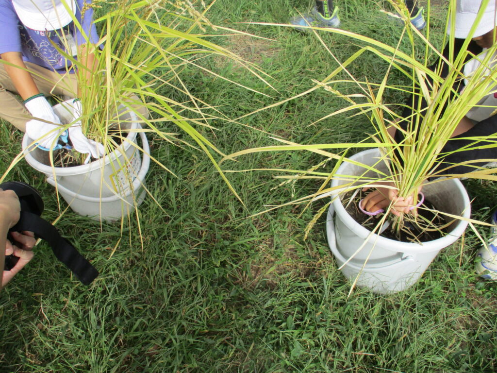 6月に植えた種もみが大きく育ち、刈り取りをしました。初めての体験に大喜びで行っていました。