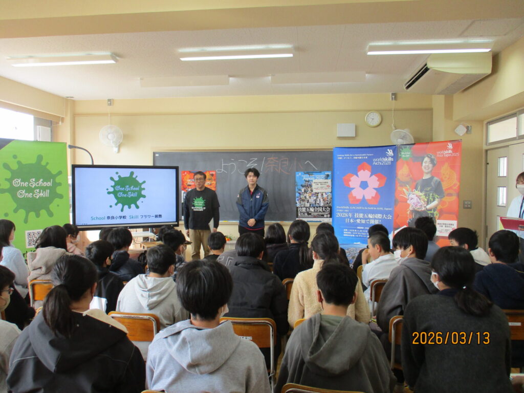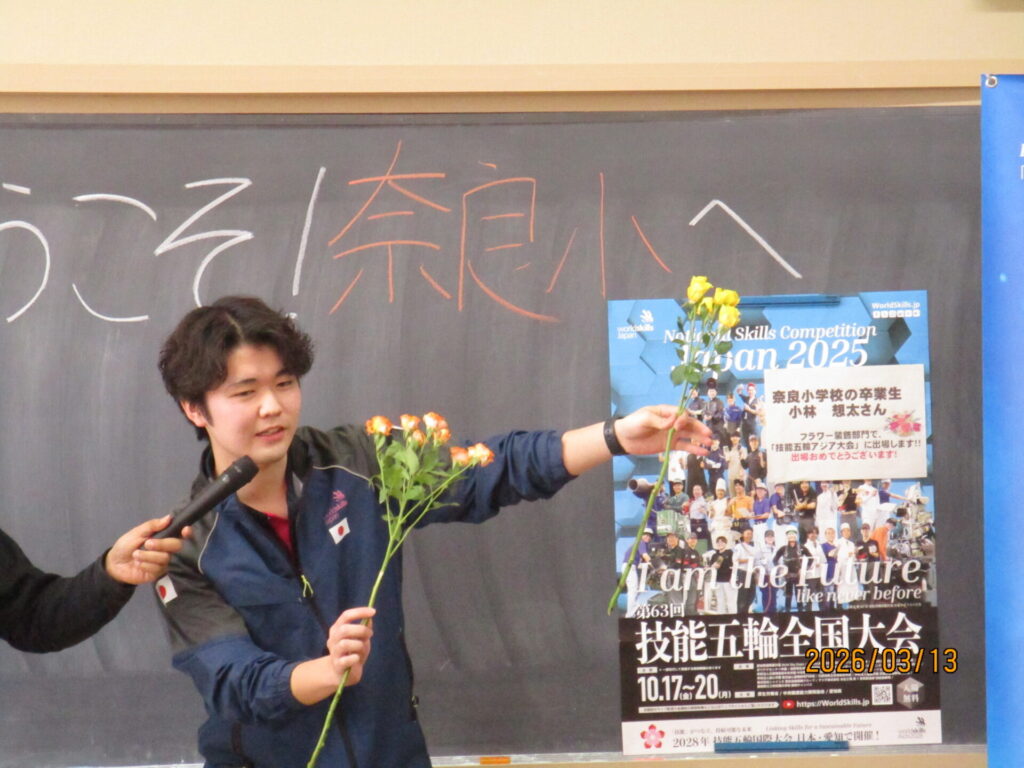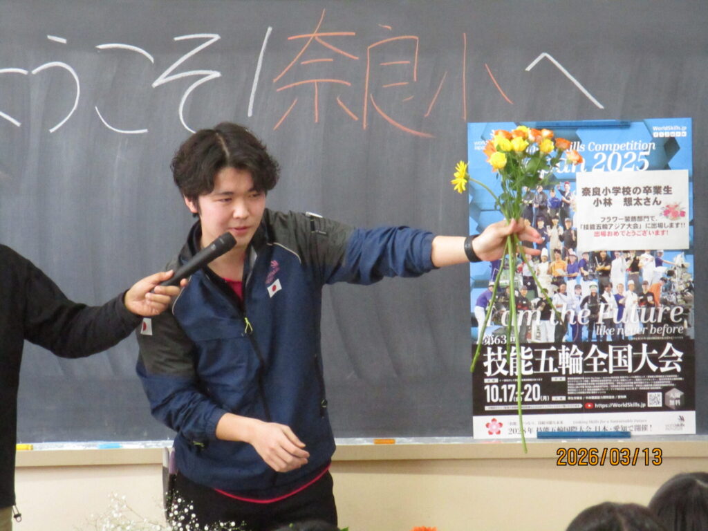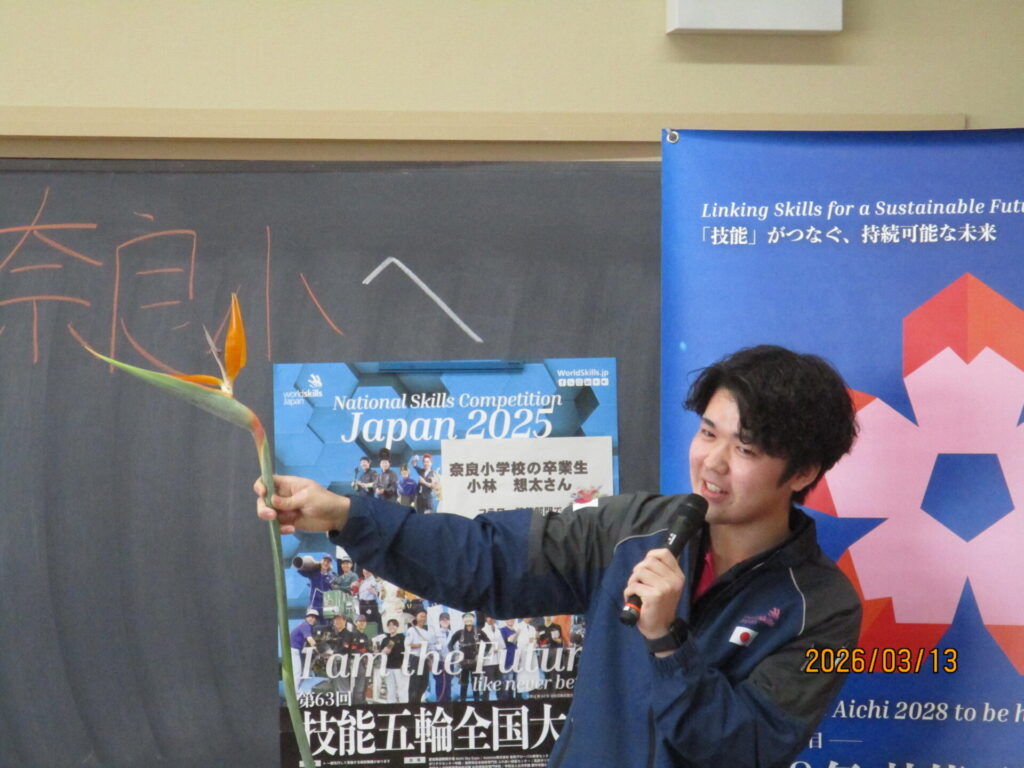 奈良小学校卒業で、昨年11月に台北で行われた「技能五輪アジア大会」に出場した、小林想太さんを招き、キャリア教育講演会を行いました。講演会では、アジア大会の様子を映像で視聴したり、フラワー装飾の様子を実際に見せていただいたりしました。最後には、「努力することの大切さ」についても話してくださり、子どもたちも熱心に話を聞いていました。