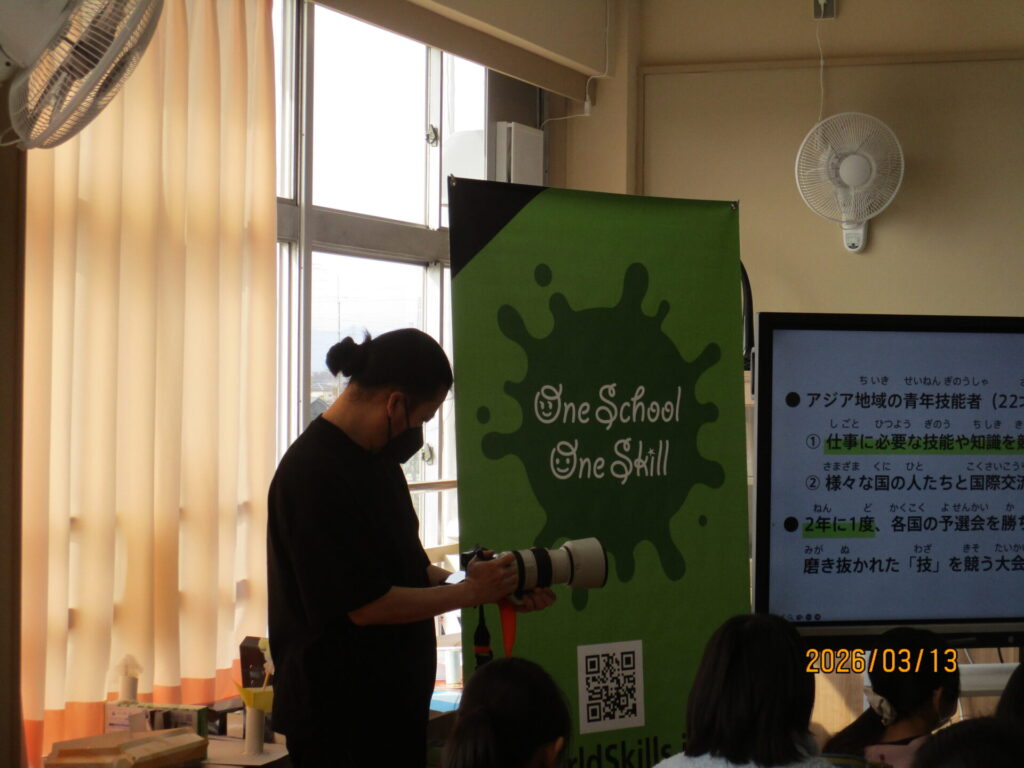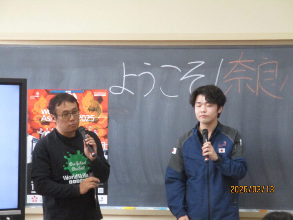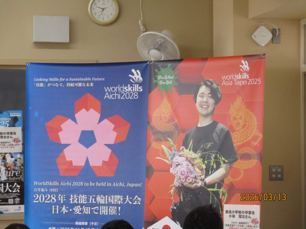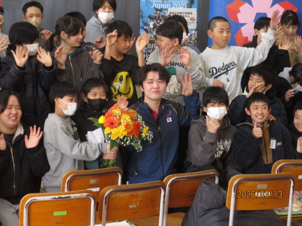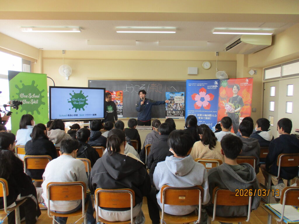 奈良小学校卒業で、昨年11月に台北で行われた「技能五輪アジア大会」に出場した、小林想太さんを招き、キャリア教育講演会を行いました。講演会では、アジア大会の様子を映像で視聴したり、フラワー装飾の様子を実際に見せていただいたりしました。最後には、「努力することの大切さ」についても話してくださり、子どもたちも熱心に話を聞いていました。
