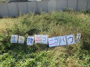 プール南側に作ったビオトープの名前が、「生き物ニコニコハウス」に決まりました。