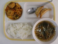 ごはん、牛乳、揚げ餃子、