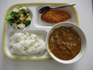 ごはん、チキンカレー、花野菜サラダ、白身魚フライでした。