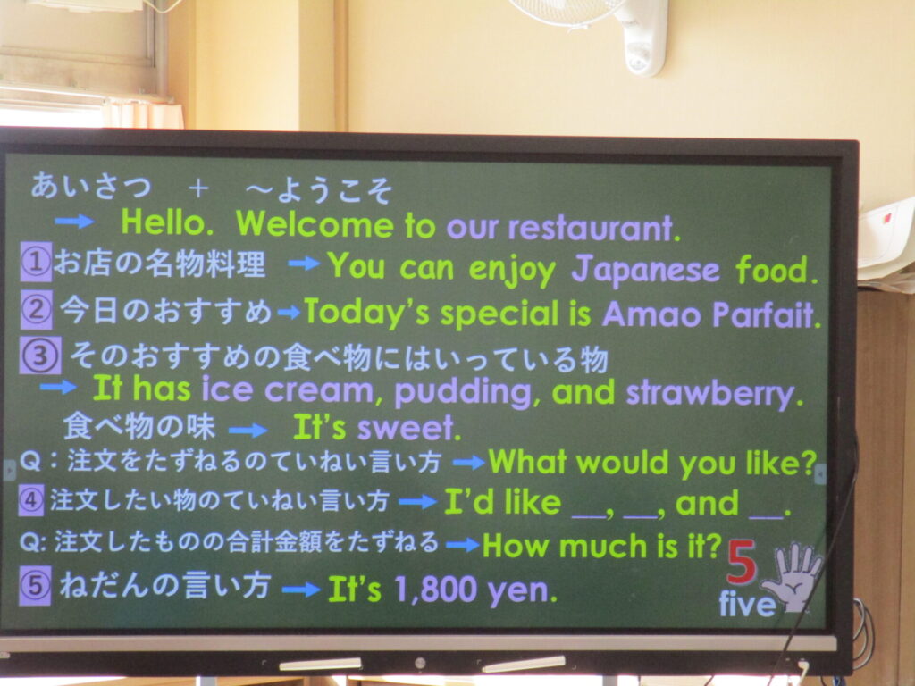お勧めの料理や好きな食べ物、値段の言い方について学習しました。