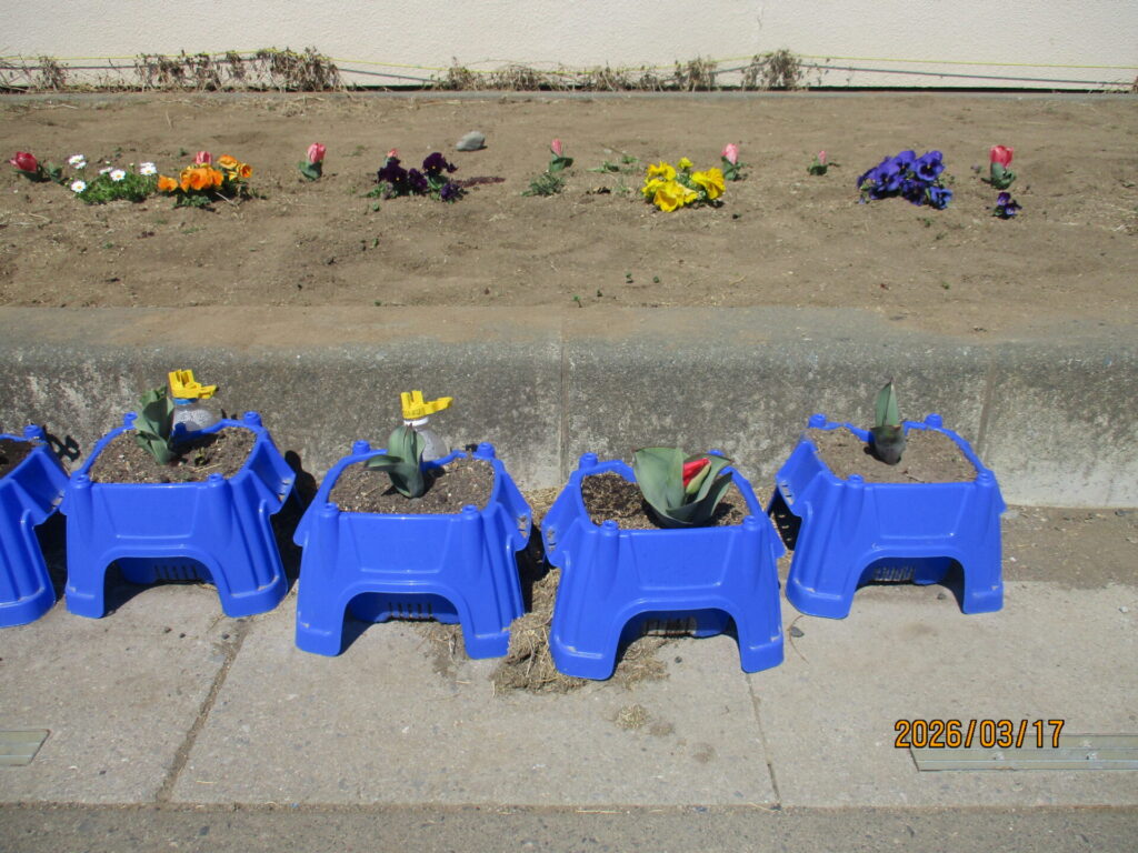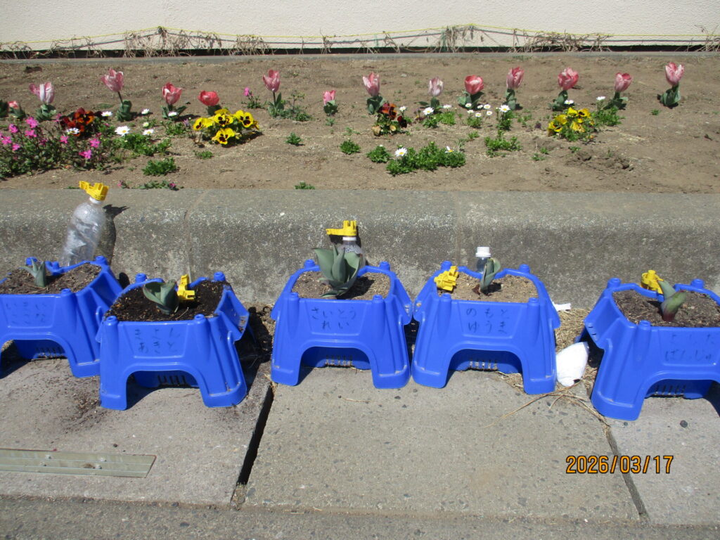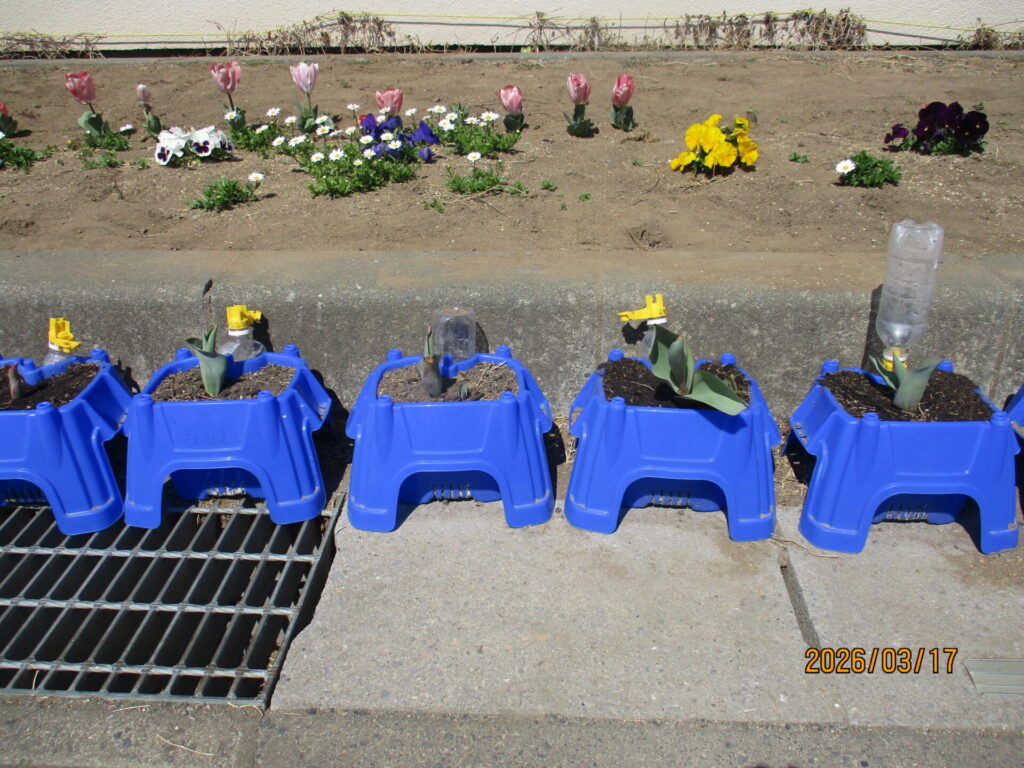 学級園や植木鉢に植えた植物が成長し、きれいな花が咲き始めました。