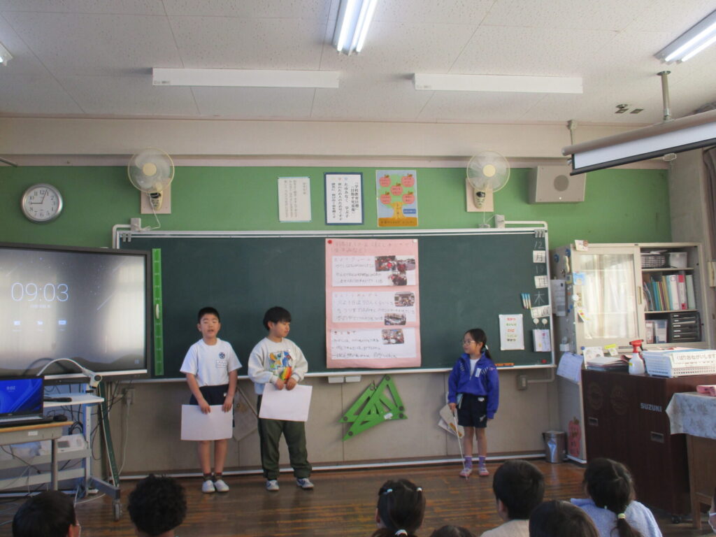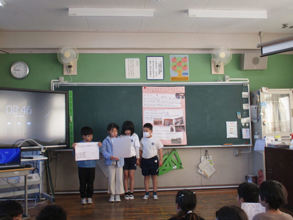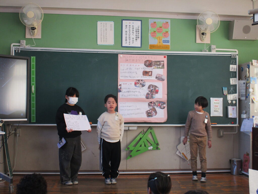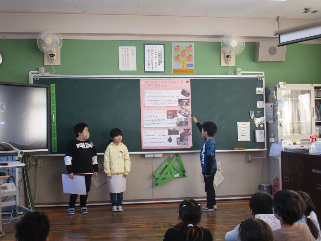 「町たんけん発表会」を行い、発表に向け、たくさんの時間を掛けて練習してきた様子が強く伝わってきました。各班とも、たんけんの様子や伝えたいことをわかりやすく話し、態度も静かに落ち着いて聞くことができていました。一年間の成長をとても強く感じる1時間でした。