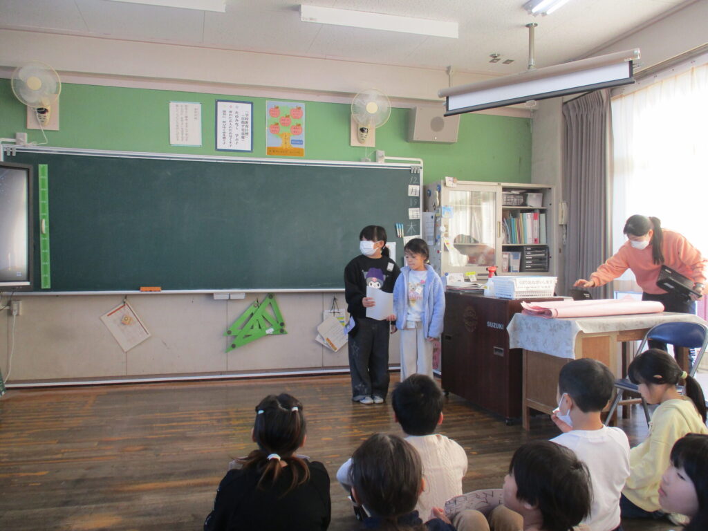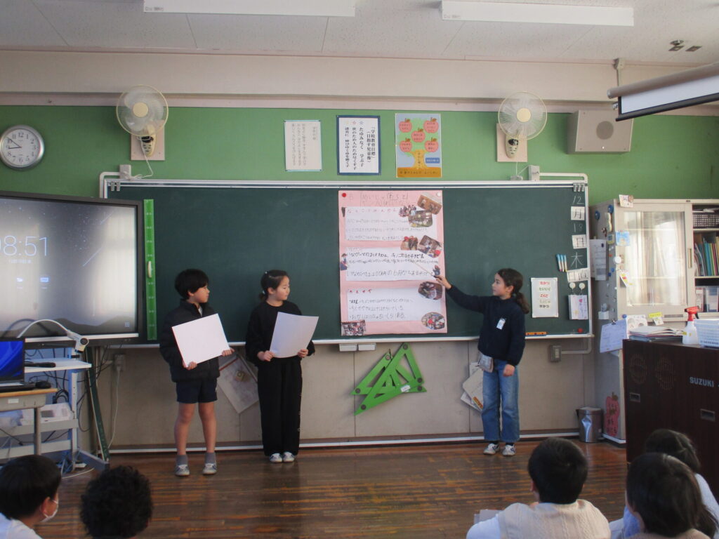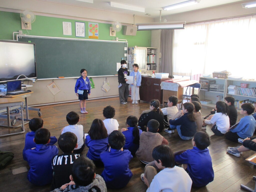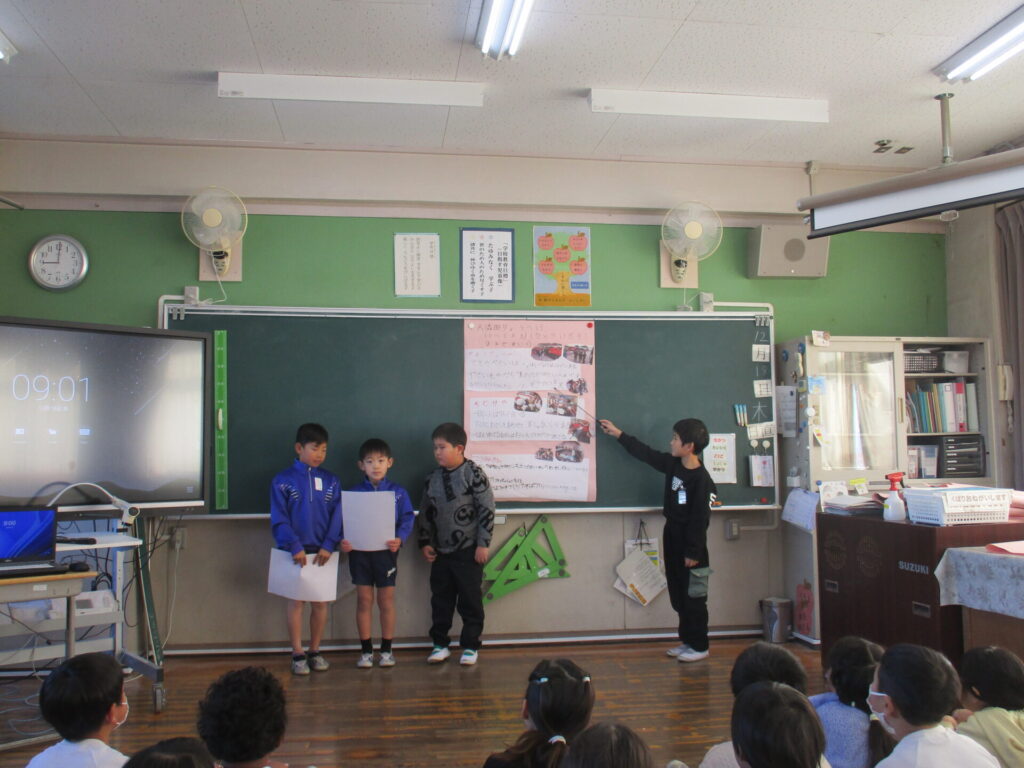 「町たんけん発表会」を行い、発表に向け、たくさんの時間を掛けて練習してきた様子が強く伝わってきました。各班とも、たんけんの様子や伝えたいことをわかりやすく話し、態度も静かに落ち着いて聞くことができていました。一年間の成長をとても強く感じる1時間でした。