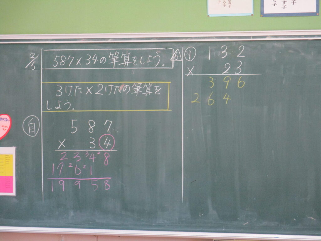 3桁×2桁の計算を筆算で行い、今まで習ったことが使えたり、役立ったりすることも理解したようです。