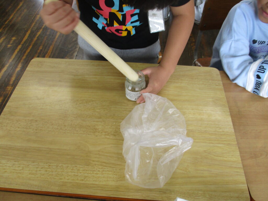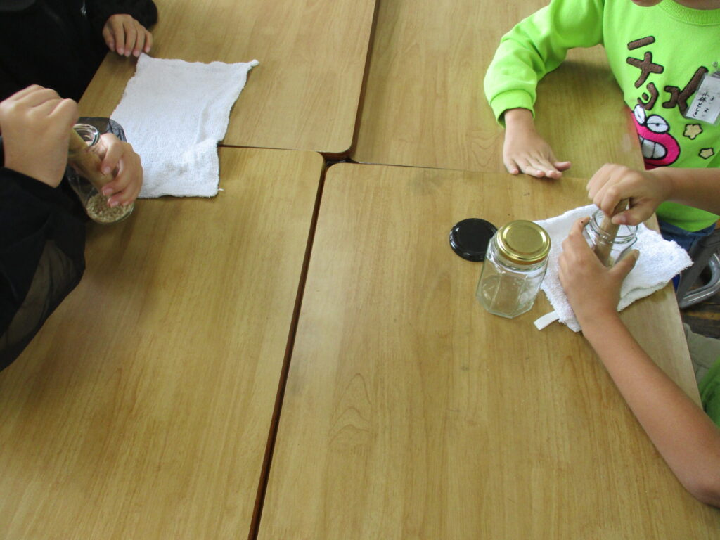 米づくり(3年) 2025年10月16日 最終更新日時 : 2025年10月16日 kumagaya_edit ガラス瓶や棒を使い、精米しました。お米が食べられるようになるまで、いくつもの工程があることを知ることができたようです。